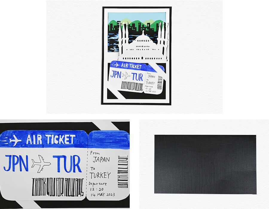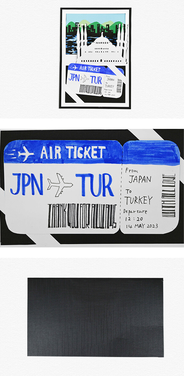 トルコに行ってみたいそうなので本物の旅行をプレゼントしたいところですがそれは厳しいので、このカードでなんちゃって旅行をプレゼントしよう、という思いがこの作品のテーマです。改まって感謝の意を述べるのは少し恥ずかしいので、メッセージをバーコードに模して飛行機のチケットをメッセージカードにしました。