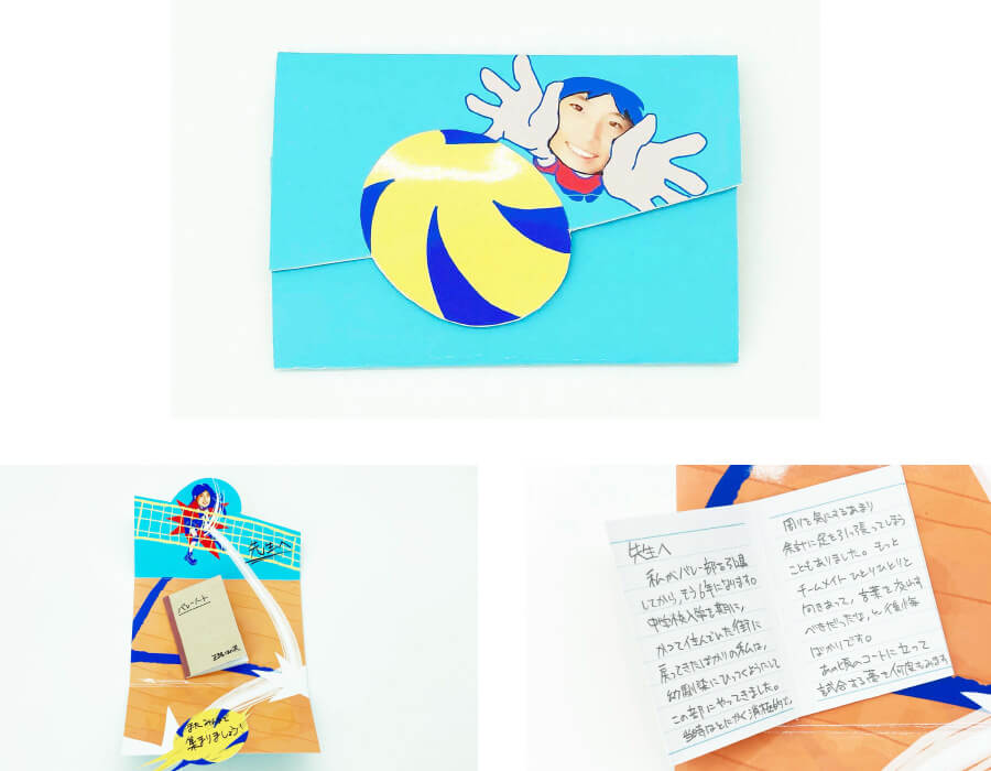 中学時代に所属していたバレーボール部の、顧問の先生に向けたものです。あの頃から6年、積もる感謝と後悔を、ボールと一緒に打ち込む!! 当時担当していたポジションは後方でボールを拾う「リベロ」でした。しかし、「受け身だった自分が想いを伝える」意味を込めて、中学生の私が上げたトスを、現在の私がアタックしました。「バレーノート」も実際につけていた記録がモチーフです。