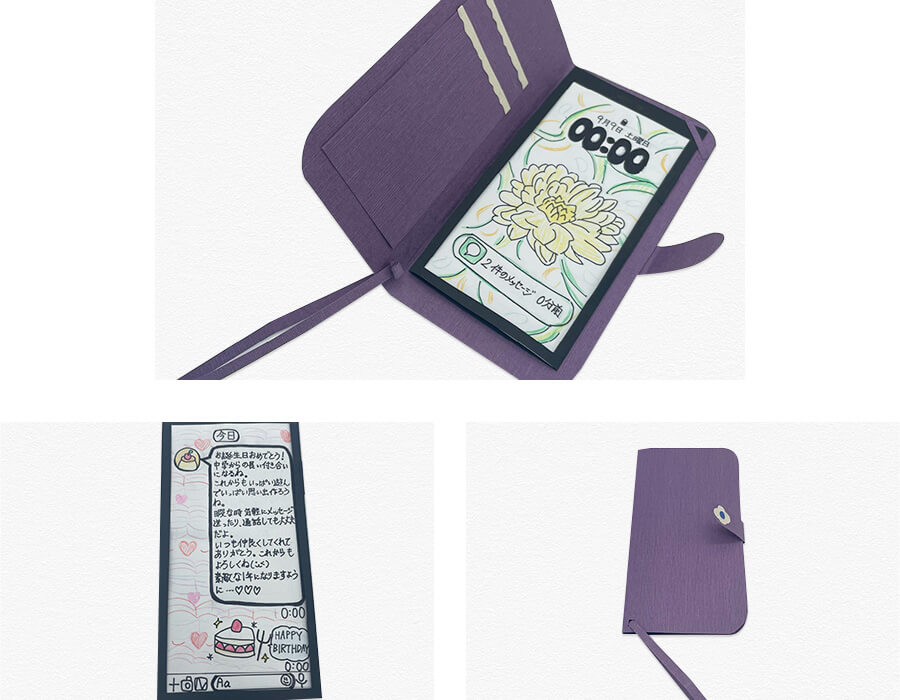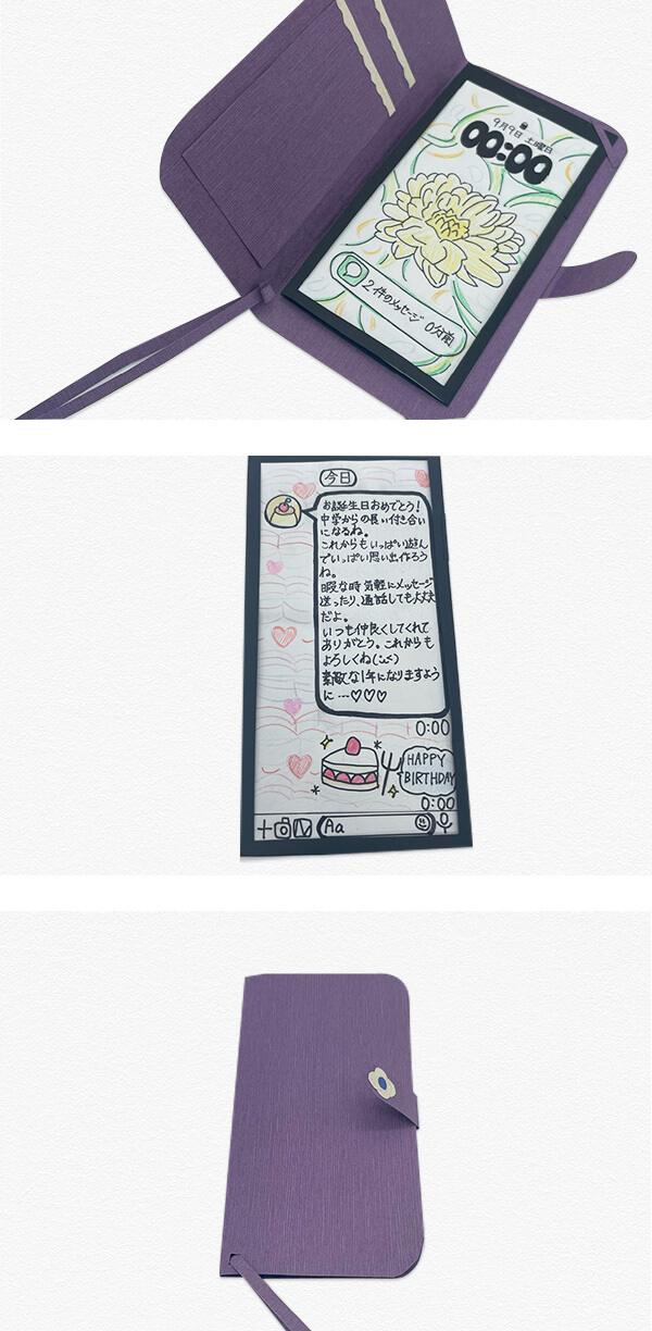 会うことも少なくなりメッセージアプリで誕生日を祝っていたのでそれをスマートフォンだけでなく紙で作り、データが消えても手元に残るようにデザインしました。0時ぴったりに祝っていると画面を誕生花の菊にしたのがポイントです。
