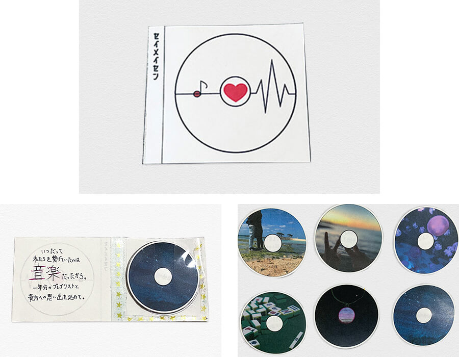 私にとってかけがえの無い人と出会って一年だったので、一年分の 思い出を形にしました。 私たち二人の培ってきた時間は、音楽と共に進んできました。なので、CDを模した形のカードに落とし込みました。