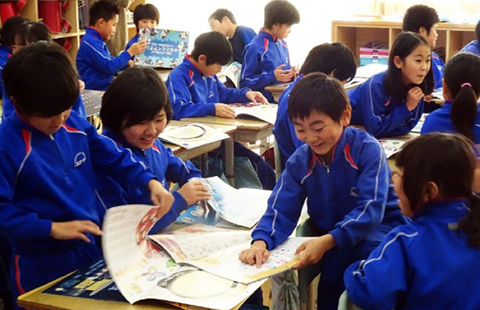 完成したカレンダーを梶原理事長、宇垣専務理事、村上監事の3 名にて大槌町役場、そして大槌学園を訪問し手渡しました。子どもたちも先生方も、あのフレーズがこうなるのかと、大喜びでした。