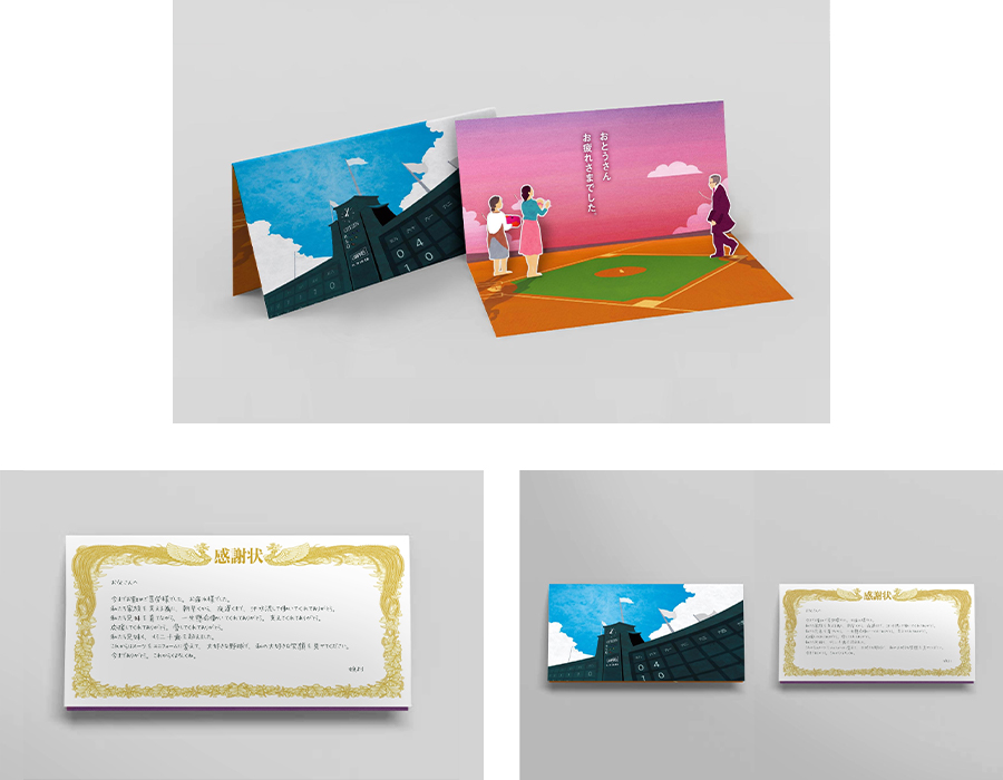 家族のために働いてくれていた父へ贈る感謝の気持ちと、定年後は趣味の野球の為に、自分の為に、時間を大切にしてほしいという思いを込めて制作しました。普段は恥ずかしくて言葉にできない気持ちを手紙に込めて。