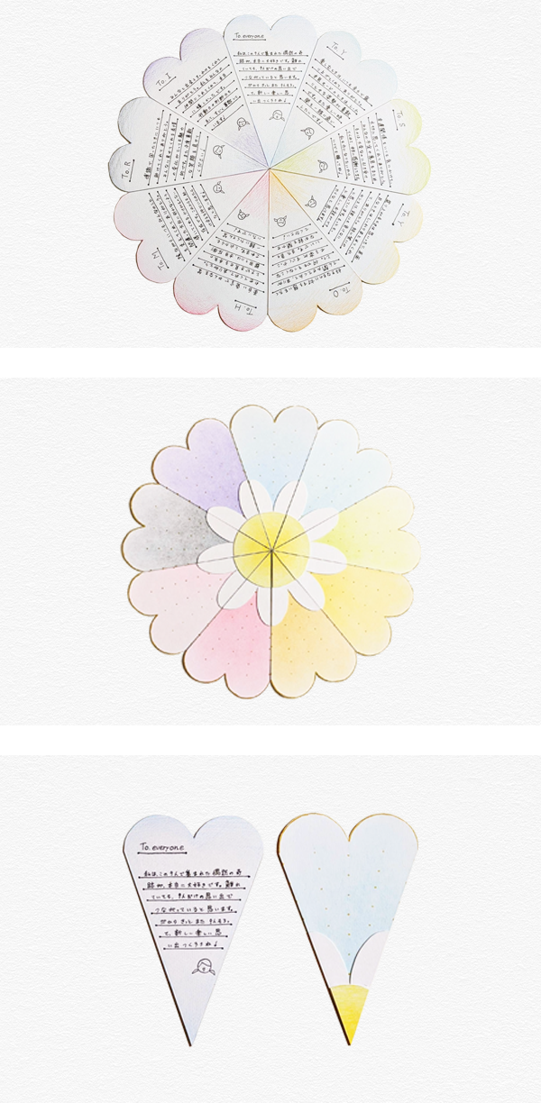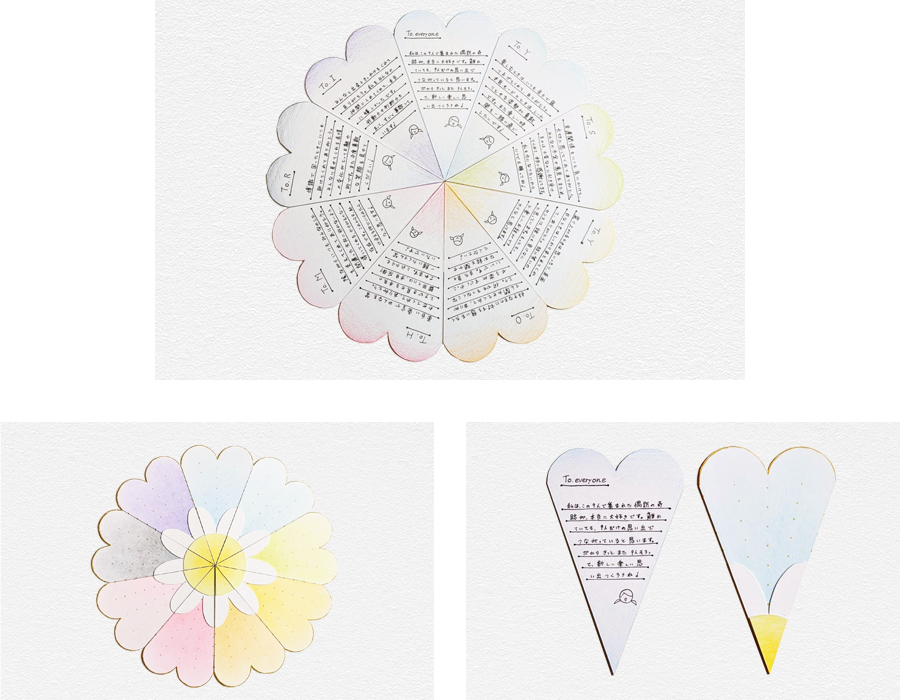 8人の友人へ、感謝の気持ちを伝えるカードを制作しました。全員の好きな色を使ったカードが揃うと花の形が完成し、また会って話に花を咲かせられるようにという願いも込めました。カードをきっかけにまた9人で楽しい思い出が作れますように。