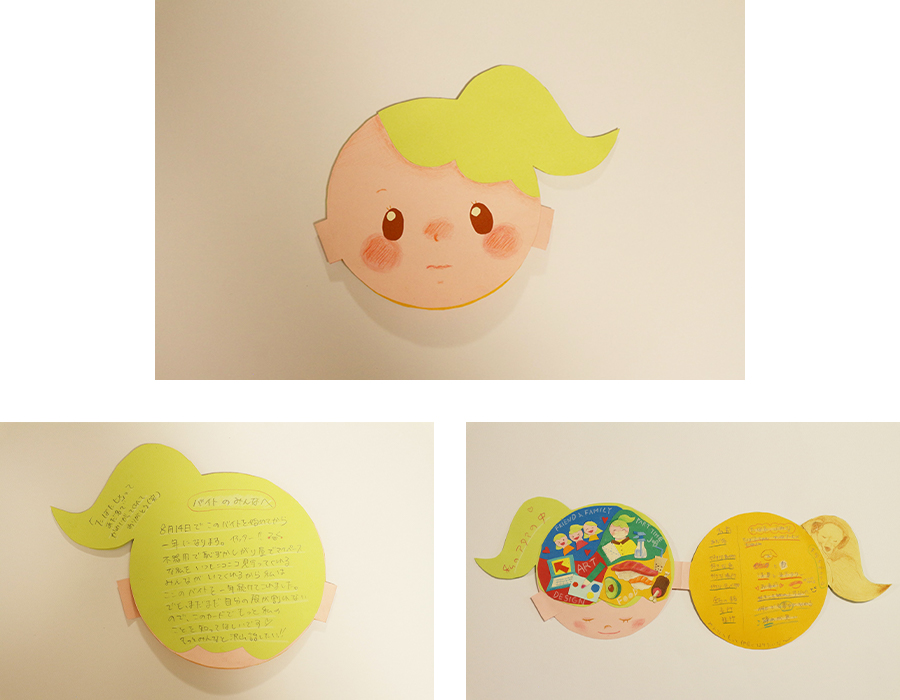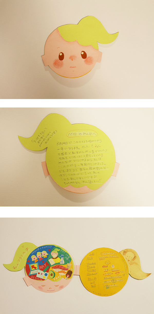 人見知りで不器用な方ということなのですが、このカードを受け取ったときのバイト仲間の皆さんの感動や驚きをすごく想像することができました。丁寧に自分らしく作り込まれたカードの仕掛けと等身大で心のこもったメッセージを通じて、普段はなかなか伝えられない「自分の頭の中」が面白くわかりやすく伝えられたのではないでしょうか。とても想いの伝わるカードデザインだと思いました。