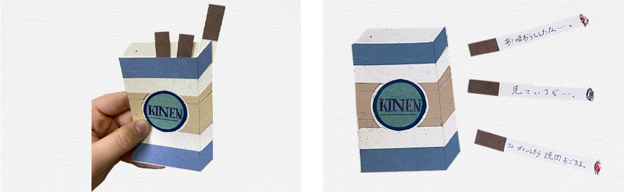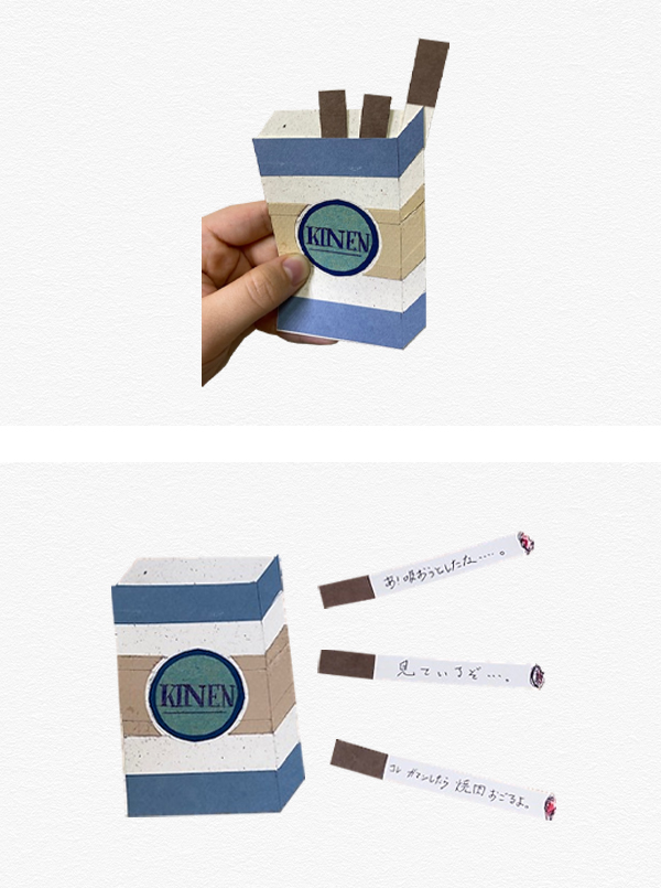 このカードには、ことばでは伝えづらいことを、クスっと笑ってしまうようなメッセージに変えてしまう魅力を感じました。作り手の、お友達への想い、やさしさが伝わってくるからでしょう。お友達の禁煙、成功すると良いですね。