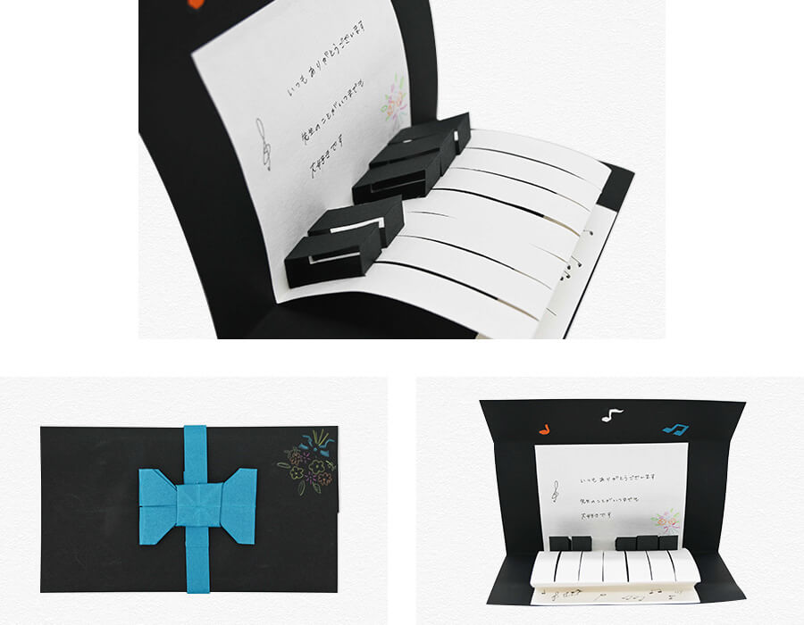 私は保育園の年中さんに上がったと同時にピアノを習い始めて約6年ほどお世話になった先生がいます。ですがその先生は私が小学5年生の時に癌で亡くなってしまいました。先生がいなくなってから私もピアノを辞めてしまいもう弾くことは滅多にありませんが、今でもピアノのことは好きだし先生から教わったことも忘れていません。ずっと大好きな先生にこの想いを伝えたくてこのカードを作りました。