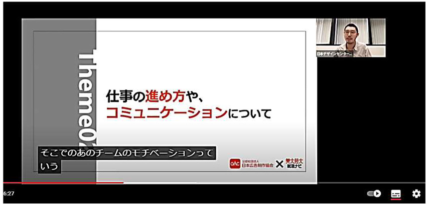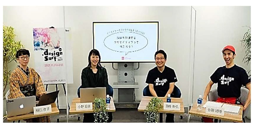 昨年に引き続き、賛助会員の㈱Tooさんが主催する 「design surf seminar」(オンライン開催)より、登壇の依頼がありました。今回は、課題を解決するクリエイティ ブをテーマに企画。登壇者には㈱スタヂオ・ユニの樋口牧子さんをファシリテーターに、㈱アクロバット田中 貴弘さん、㈱電通テック小野愛佳さん、㈱博報堂プロダクツ佐藤翔吾さんにお願いいたしました。 課題を解決できるこの仕事は、人を楽しませたり元気にし、人が笑顔になる瞬間に立ち会える。「想像」と「創造」が課題解決の鍵になる等々、このセッション自体も ご覧いただいた方々に楽しんでいただけたと思います。