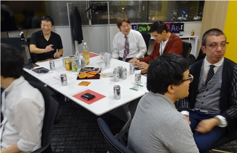 いつもと同様に、会社の同僚同士が同じ席には着かずに始まるのを待っていますが、既にワイワイと話し出しています。