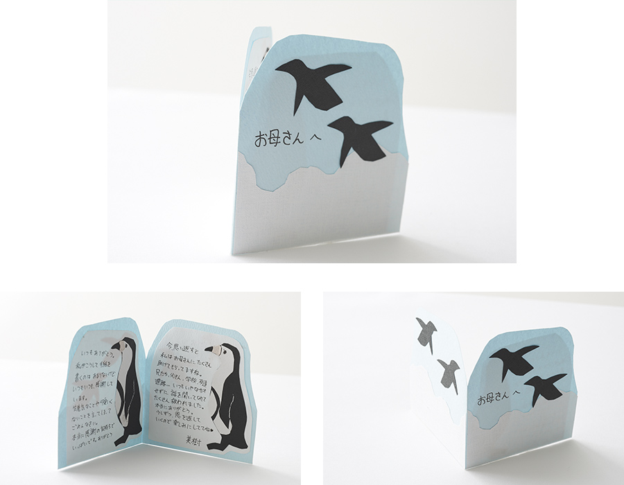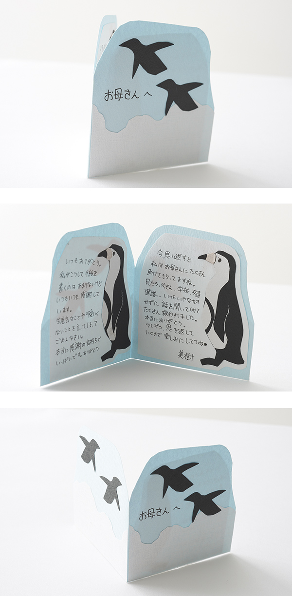 私を産んでくれた日を記念日にしました。 母の大好きなペンギンを用い、左ページは母、右ページは私を表しています。 母ペンギンを追いかける雛をイメージしていますが、この雛はすでに大人と変わりません。 巣立ちのときが私にも、雛にもきていることを表現しました。 これからは、母への恩を返したいなと思い、制作しました。