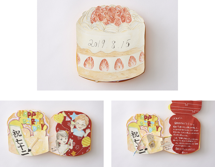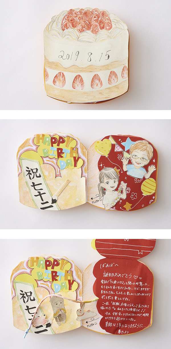 いままで祖母の誕生日は、ちゃんとお祝いしたことが少なく、なかなか会にも行けないので、いままでの「ありがとう」という気持ちを込めて、つくりました。 メッセージの中から、祖母が趣味でつくっている人形のイラストを入れたり、祖母が得意な書道を入れたり、祖母が見て楽しんでくれるような作品にしました。