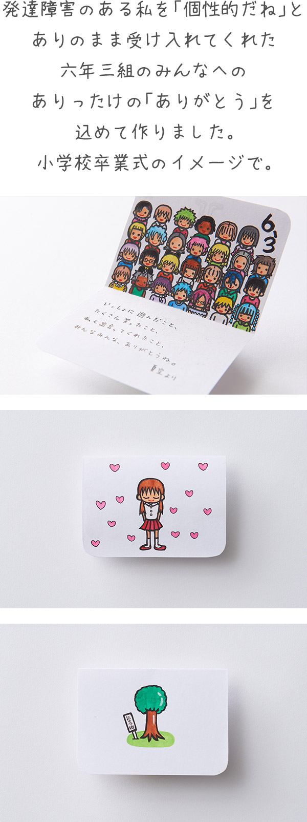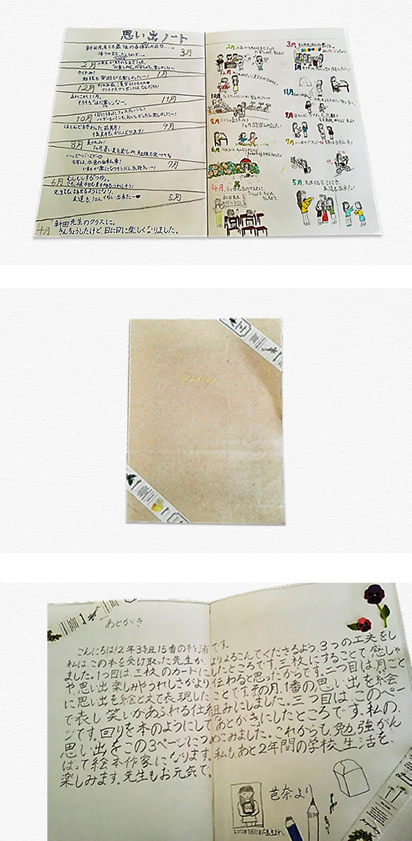 2年生のたんにんで、本が大好きな先生へありがとうの感謝の気持ちを本のようなカードで、伝えました。一年間の思い出や、行事・楽しかったことや嬉しかったこと。そして今は、別の小学校で働く先生に先生に、あの1年間をもう一度、思い出してほしいから…。先生への感謝や思いを、三枚のカードにせいいっぱい表現しました。もらった先生がより喜んでくださるよう、笑顔があふれますよう、あざやかな、明るい色を使って楽しく、二年生を思い出しながら作りました。今は、一緒にはいないけどまた、一緒に過ごせる、楽しく・素晴らしい日々が来ることを祈っています。あの優しくすばらしい先生への思いを本で伝えました。