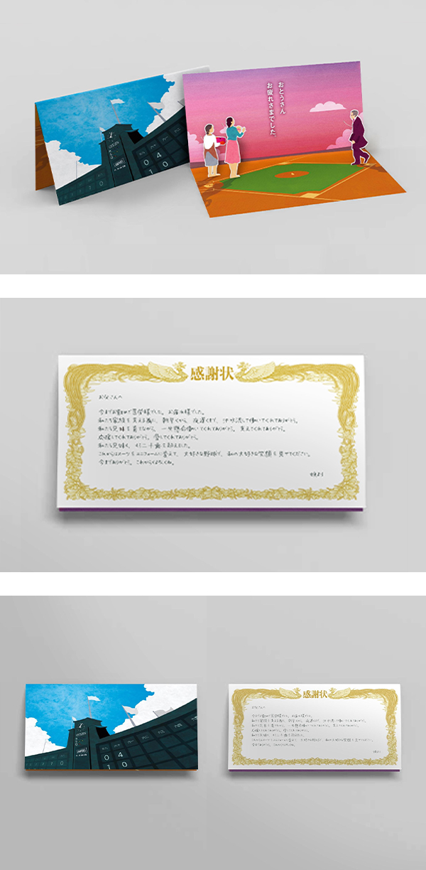 家族のために働いてくれていた父へ贈る感謝の気持ちと、定年後は趣味の野球の為に、自分の為に、時間を大切にしてほしいという思いを込めて制作しました。普段は恥ずかしくて言葉にできない気持ちを手紙に込めて。