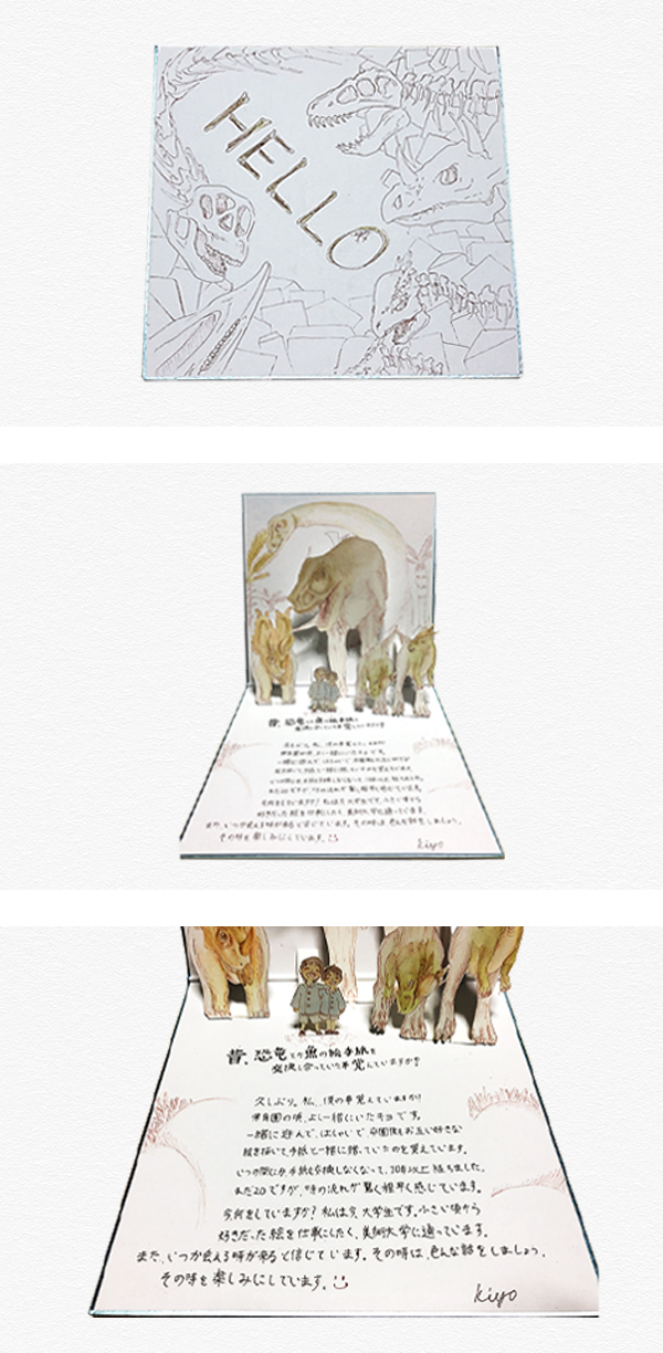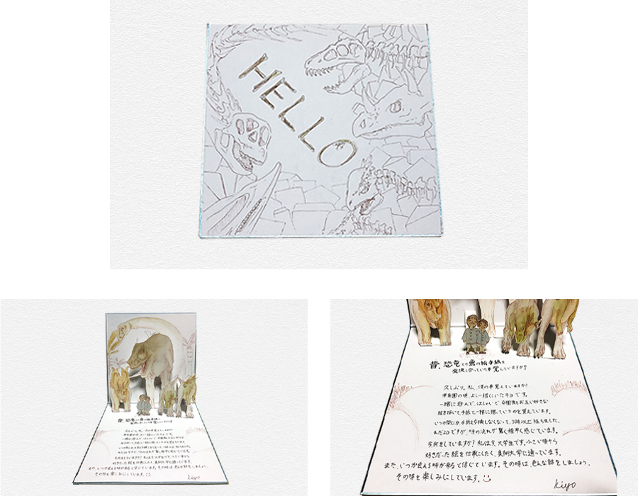 保育園生の頃仲良くしていた友人が引っ越すと聞き、同じ学校に行けないとわかった私は卒園後、その友人と好きな恐竜や魚の絵と手紙を描いて贈り合っていました。これはその子の事とその頃を思い出して制作した手紙です。