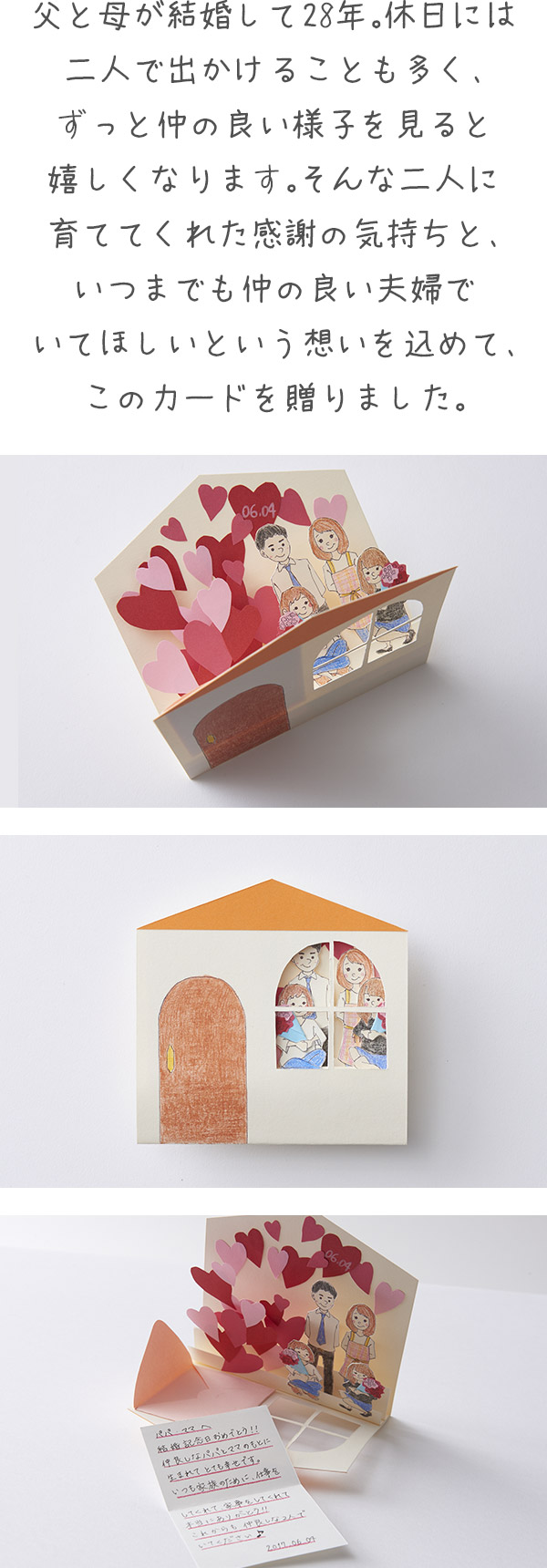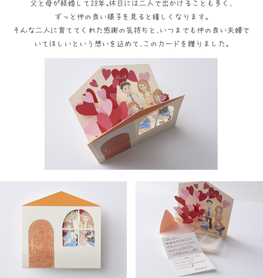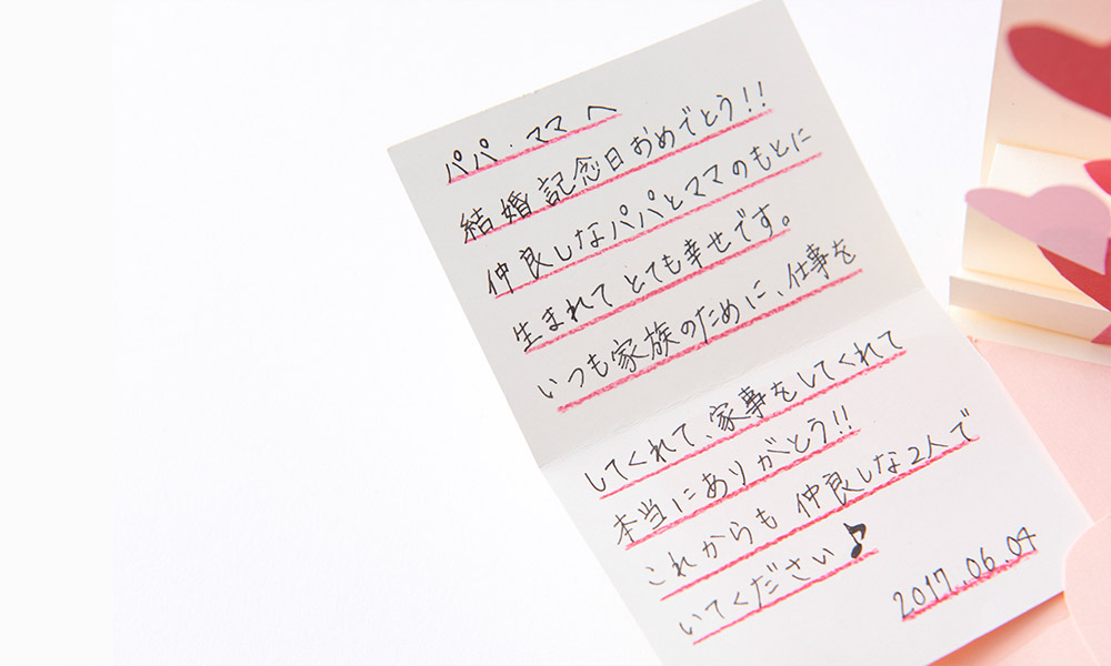 夫婦になって長年、今では恥ずかしくて言えない言葉や心の中で伝えているキモチを表しました。それぞれの封筒に色んなキモチが入っています。 みんな、ありがとう!