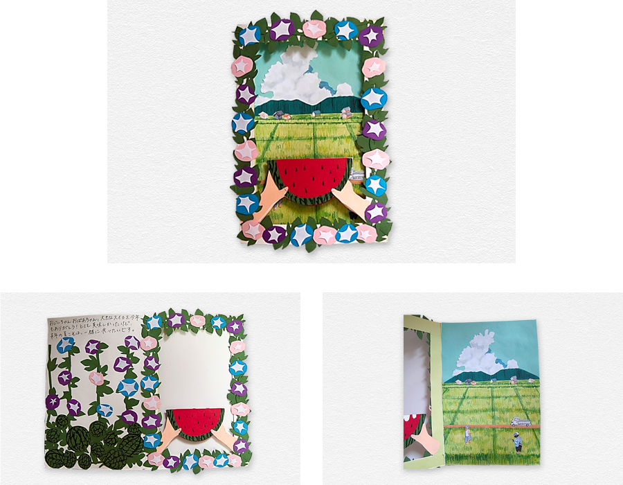 毎年夏になると、祖父母の家に遊びに行くのですが、そのとき畑で育てた、大きくて甘いすいか食べるのが、一年の楽しみでした。しかし、今年は帰省することができなくなってしまい残念がっていると祖父母が、すいかを宅配で届けてくれました。そんな祖父母に感謝を伝えたいのと、来年こそは一緒にすいかを食べたいと思い、制作しました