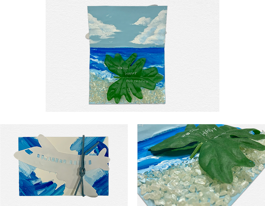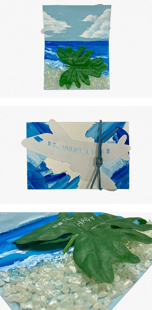 新型コロナウィルスの関係で好きな海外旅行に行けていない母へ、少しでも旅行に行った気分になれるよう、誕生日の記念に母の好きな海と空をメインにしてカードを作りました。
