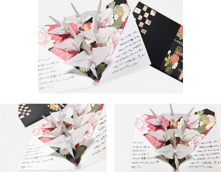 手術を控えているおじいちゃんへのお手紙。今年はコロナウイルスの影響で、病院にお見舞いに行けず、しばらく会っていないのでとても心配をしていました。早く元気になるようにという私の思いを折り鶴が届けてくれるのではないかと思い制作しました。