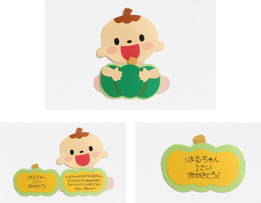 かぼちゃが好物の娘が1歳を迎えました。毎度食べっぷりに驚かされている父母からの「これからもあなたの"おいしそうに食べる顔"を見ていたい」という想いがつまったバースデーカードです。