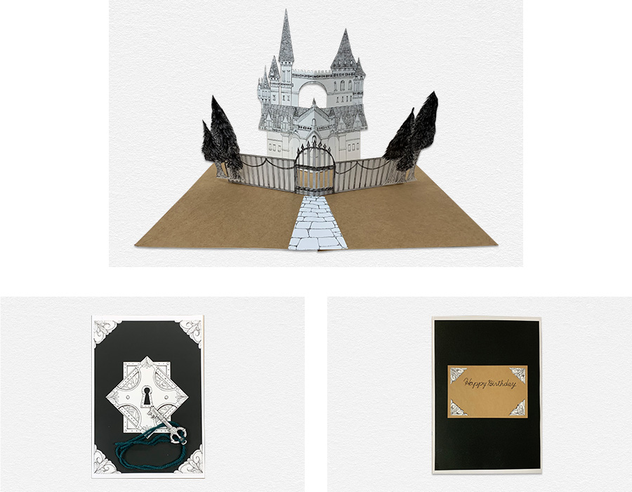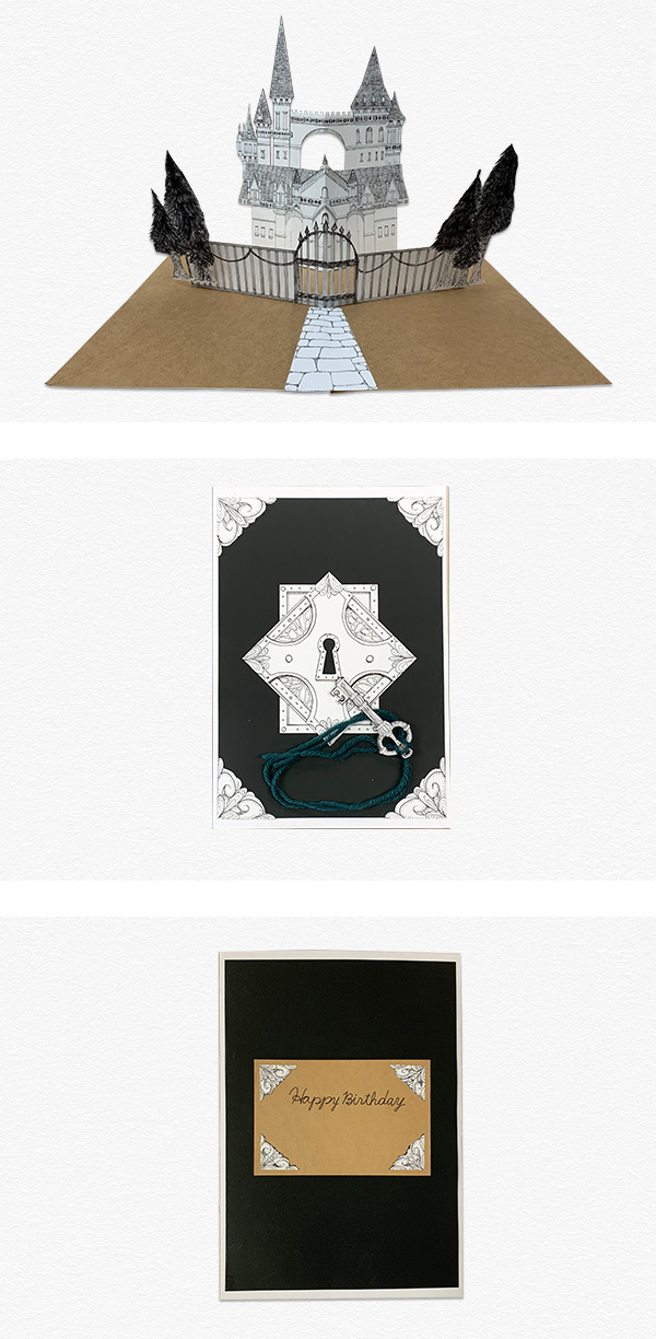 いとこのあいちゃんの12歳の誕生日。いつも西洋のお城や洋館の写真集を眺めてはうっとりしているあいちゃんにお城をプレゼントしたいと思って作ったカードです。