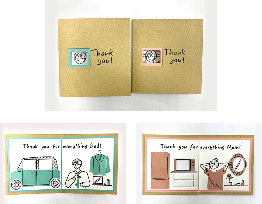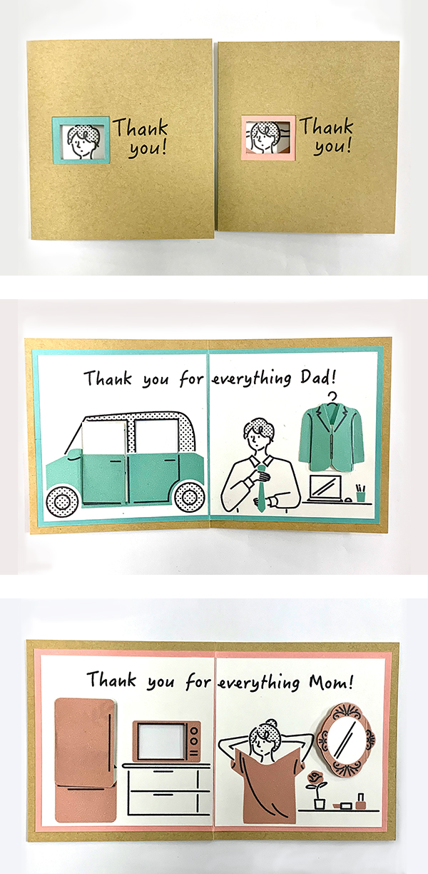 「お母さん」に感謝を伝えるカードを制作しました。お母さんは偉大です。家族の中で誰よりも働いてくれている存在です。「お母さん」という休みのない仕事をしてくれていることに感謝を伝えるために、今までしてくれた事をメッセージカードにしました。