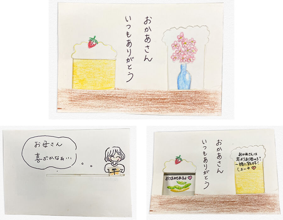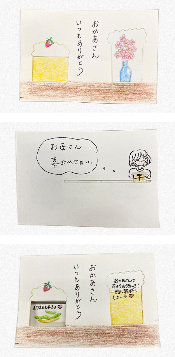 小さい頃は母の日に花を贈っていましたが、自分が大人になって母はお花よりもお酒が好きなことに気付きました。いつも支えてくれてありがとうという気持ちとお酒を一緒に飲める年齢まで育ててくれてありがとうの気持ちを込めてこのカードを作りました。