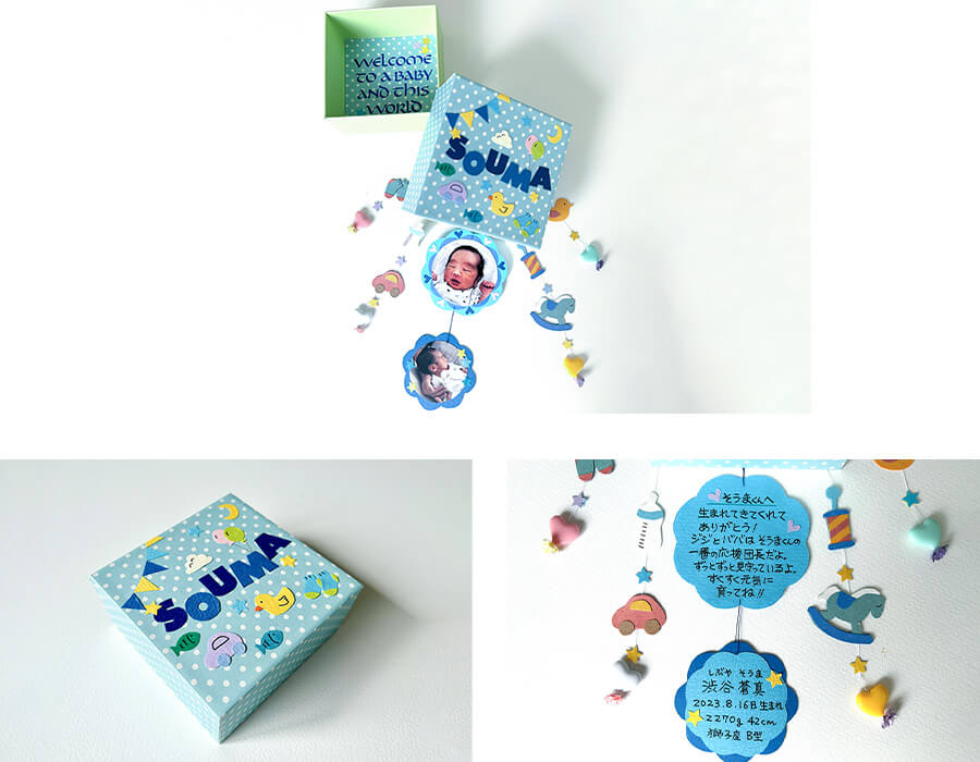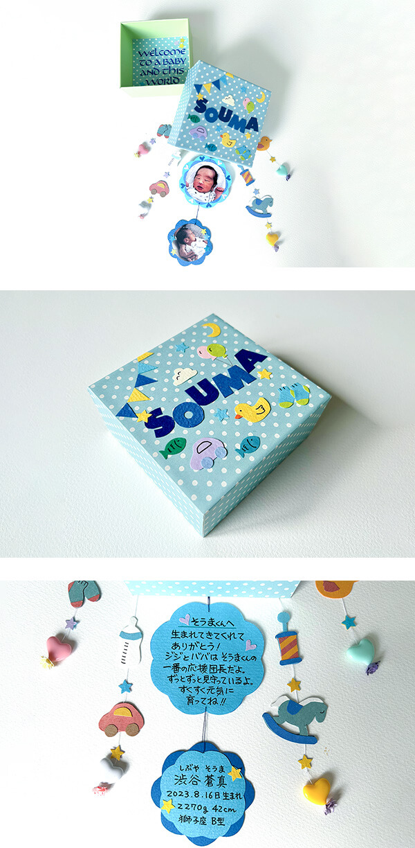 お誕生日にはもちろん、これから先、時には落ち込んだりした時にこのBOXを開けると笑顔になれるようにと作りました。