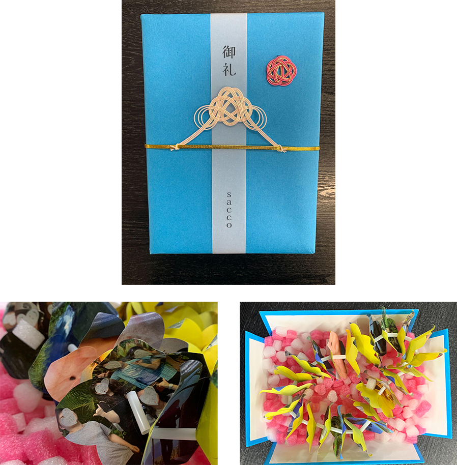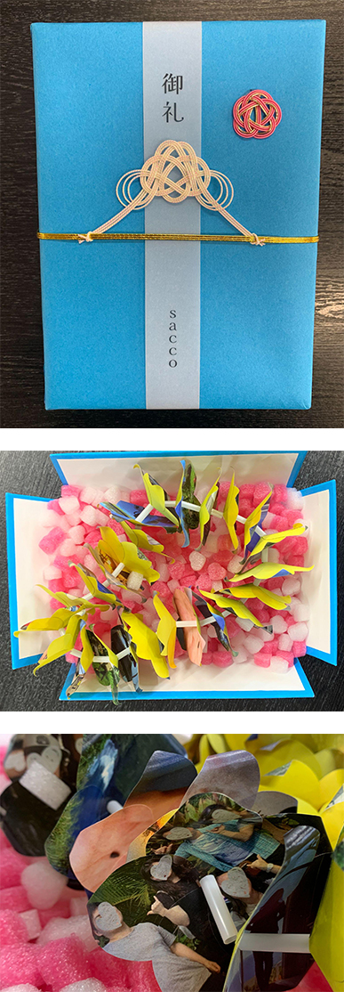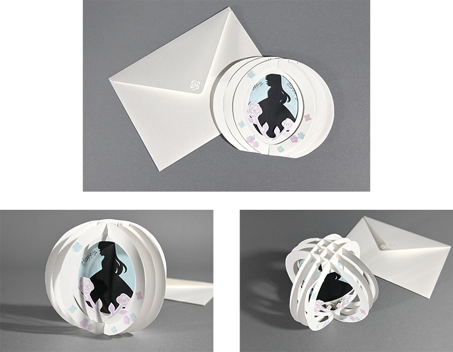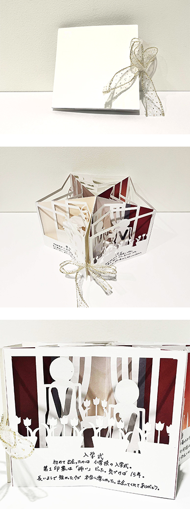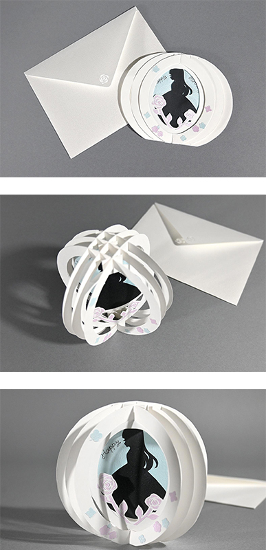 封筒から取り出し立体的に展開するデザインは、丁寧な造作もあって、いつまでも眺めていたくなるオブジェのような出来栄えで、とても印象に残りました。素敵な作品、ありがとうございました。