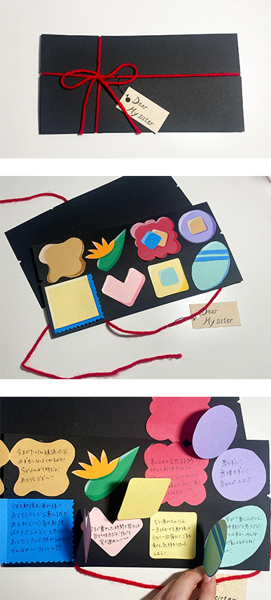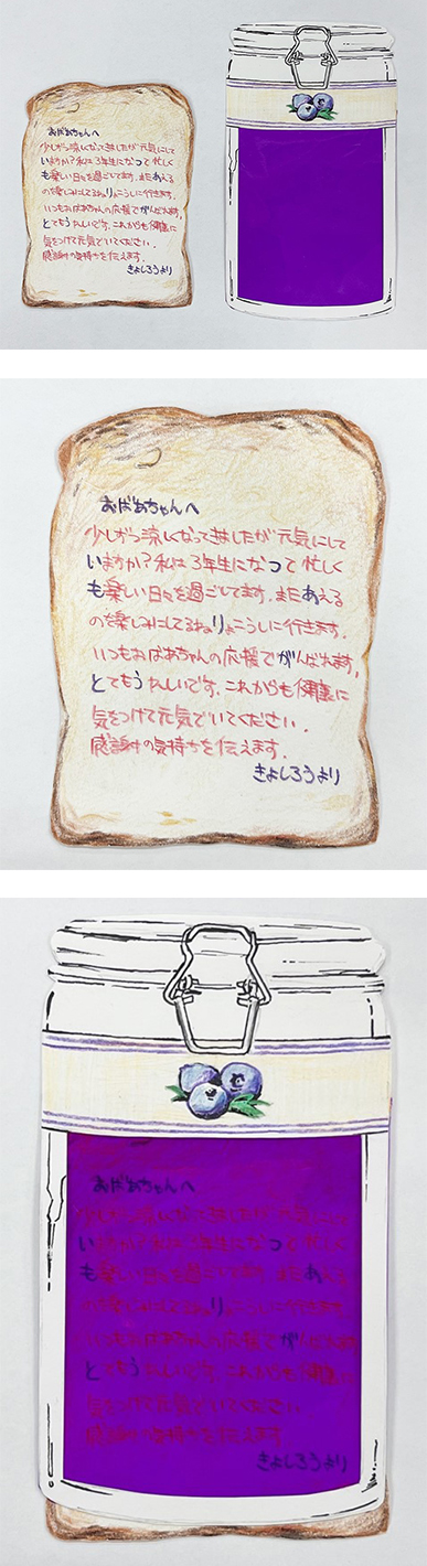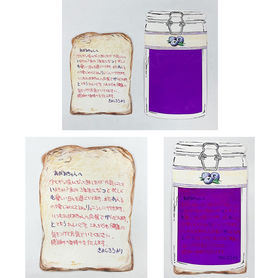 おばあちゃんからいつも 作りのブルーベリージャムをいただいているので、感謝の気持ちを込めたカードを制作しました。ジャムをパンに重ねるとメッセージが浮かび上がるように工夫しました。また帰省して会える日を楽しみにしています。