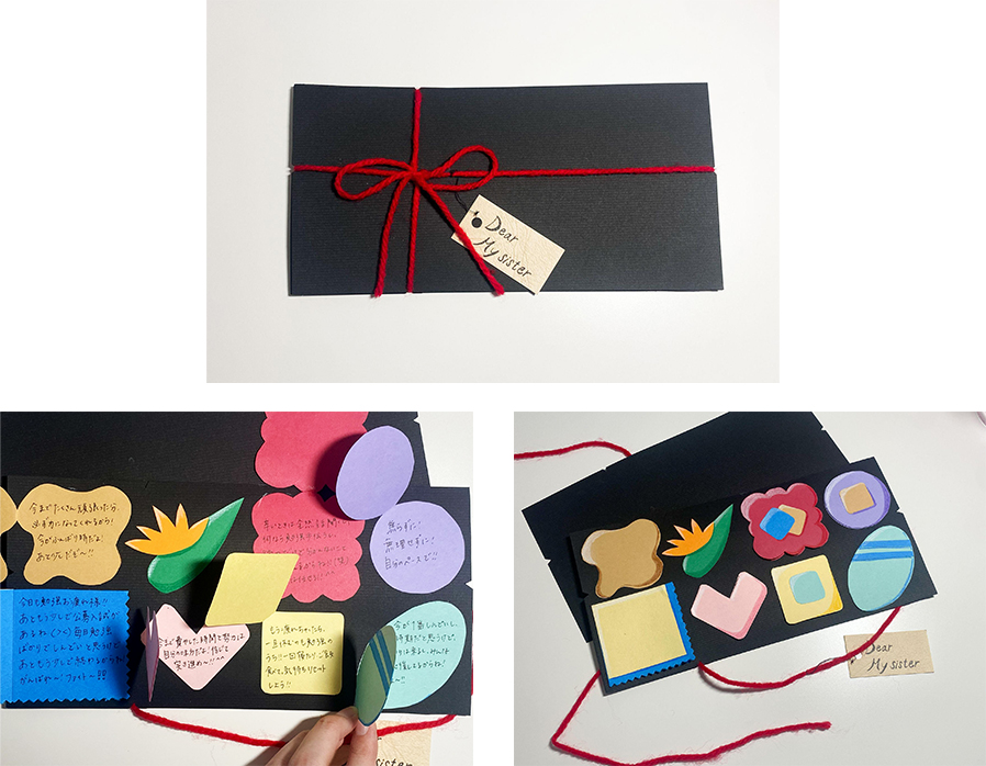 チョコレートを一つずつ食べるように、何かあったら一つずつメッセージを読んでほしいという田村さんの想いが伝わります。造形にもう一工夫あるとさらに良いと思いましたが、やりたいことと表現しようとしたことが一致していてとても素敵な作品と思いました。ささやかに応援しているつもりで、言葉の一つ一つから妹さんを応援する気持ちが溢れています。