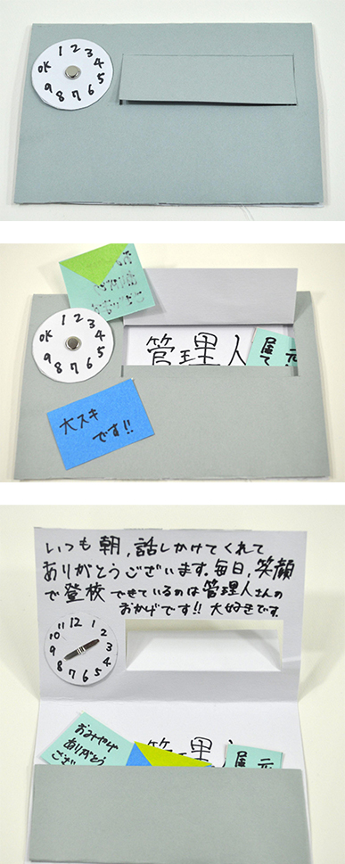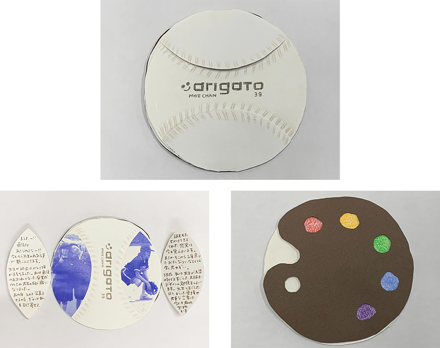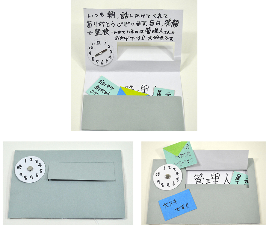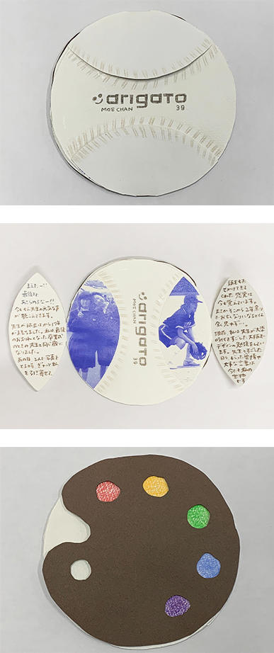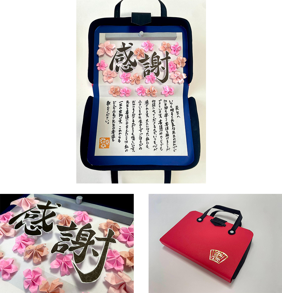 最初は写真での審査で、書道ケースは本物なのかと思っていました。しかし実際の作品を観ると、ケースも手作り!その丁寧さに驚きがありました。また感謝の文字も立体的につくられていて、受け取った先生も大喜びでしょう。
