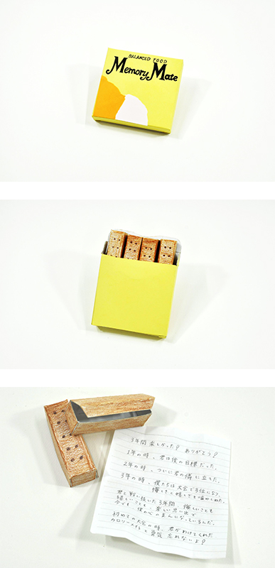 試合の日よくカロリーメイトをわけて食べていたので、カロリーメイト風の箱の中に想いをこめました。