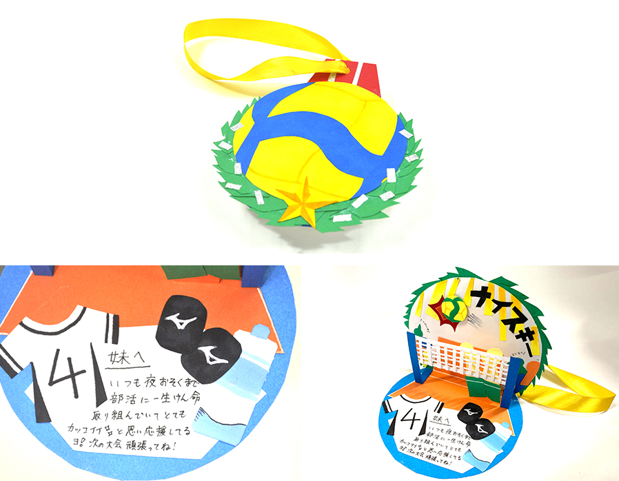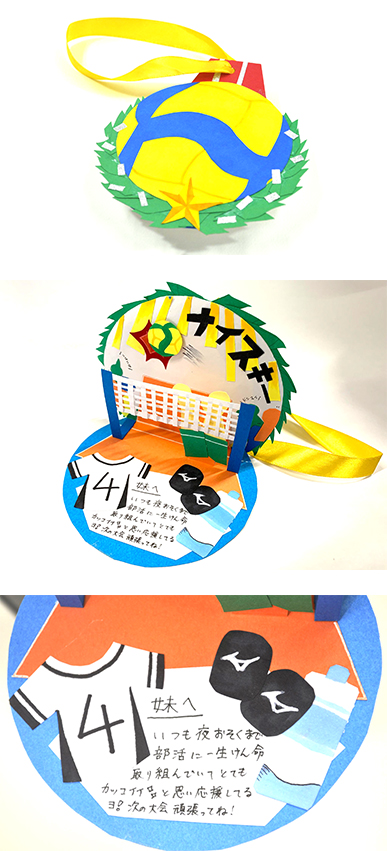 初心者ながら毎日家でもボールに触れ続け、夜遅くまで部活動に励んでいるその努力。いつも練習しているスパイクが決まるように試合本番でも失敗しない!させない!!という強い想いを込め、全力を出し切れるようにエールを送ります。
