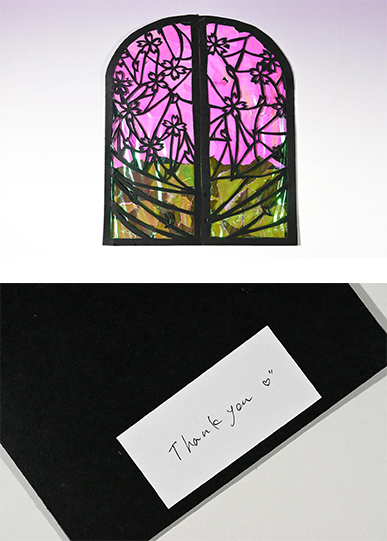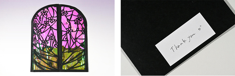 私が春休みに2週間ほど入院していた時、看護師さんが「あそこの窓から桜が見えるよ」と教えてくれました。手術後の辛いリハビリ中な上、しばらく外の景色を見ていなかったため、とても元気をもらいました。その看護師さんに感謝を伝えたくて、思い出の桜と窓をモチーフにカードを作成しました。