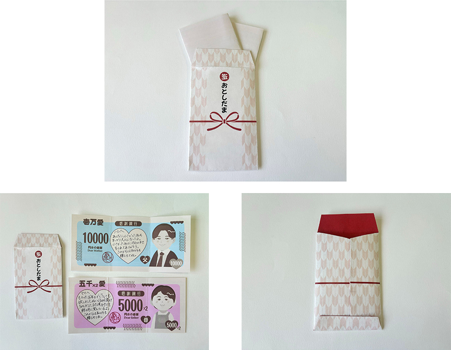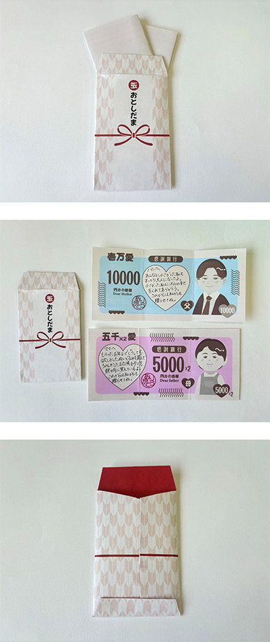私の家ではお年玉は20歳まで貰えるというルールがあり、幼かった私は毎年元旦を楽しみにしていました。20歳を過ぎて初めて迎える来年の元旦には、逆に私から両親へ今までの感謝の気持ちを伝えたいと思い、"逆"お年玉を制作しました。