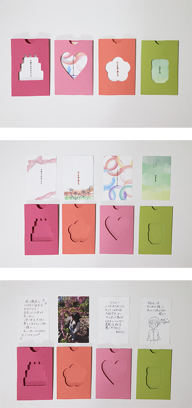 誕生日、交際や結婚記念日、感謝する日、疲れを癒したい日などいつもは恥ずかしくて言えない言葉でもメッセージカードでなら伝えられる、そんなカードを制作しました。状況により、入れ替えできる仕様にしました。