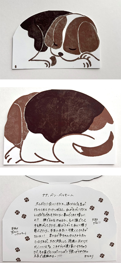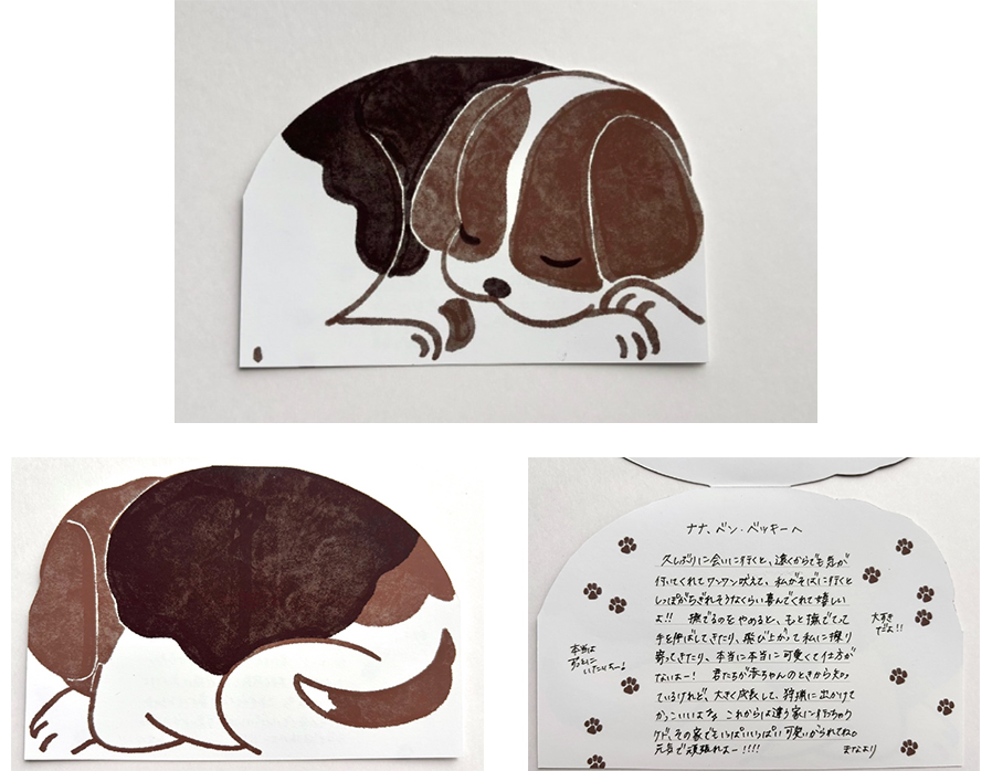 祖父母の家(山梨県)で飼っている犬に届けたいです。私は東京に現在は住んでいるため、なかなか会いに行くことができません。近いうちに飼っているうちの犬3匹が違うお家に行くことになってしまいました。直接別れをいえないまま、会えなくなってしまうので手紙を送ることにしました。赤ちゃんの頃から知っているので、他の人の手に行ってしまうのが本当に悲しいです。ですが、飼ってくれる人にいっぱい可愛がられて、元気に頑張って欲しいという思いを書きました。