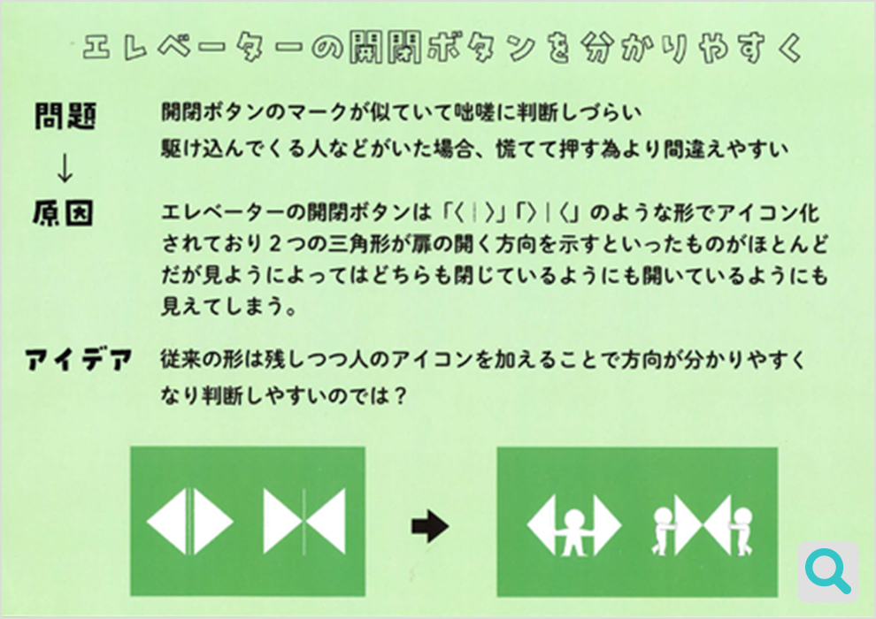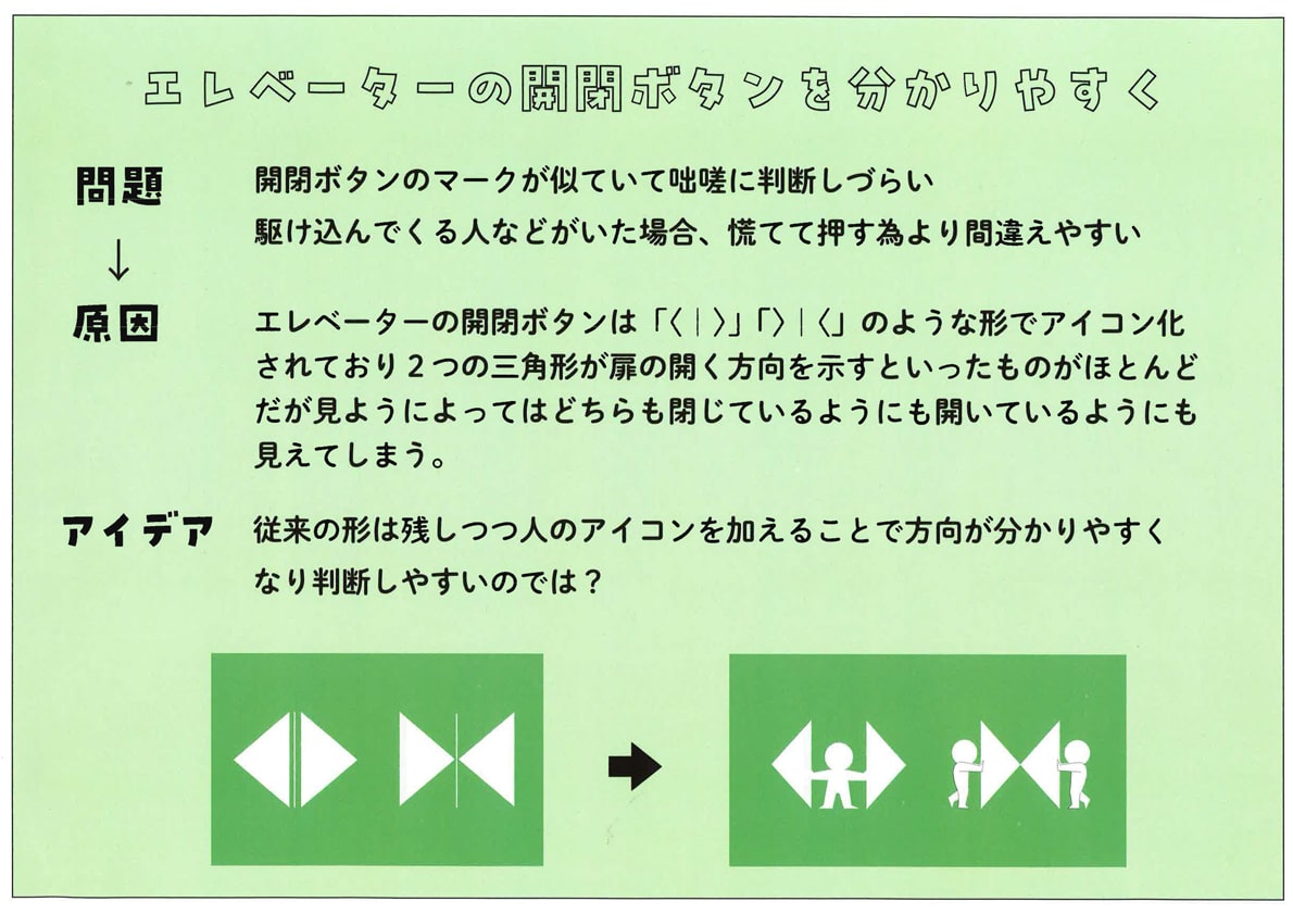 これは心理的な側面ですが、このボタンは見た目が一瞬わからないわけです。開けるボタンを見て閉まっていると感じる人もいることでしょう。何気ないことで、日頃思っていても忘れがちなところによく目が向きました。
