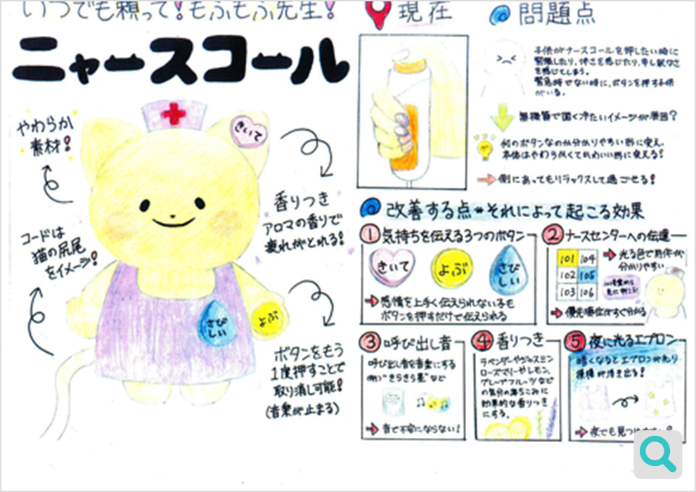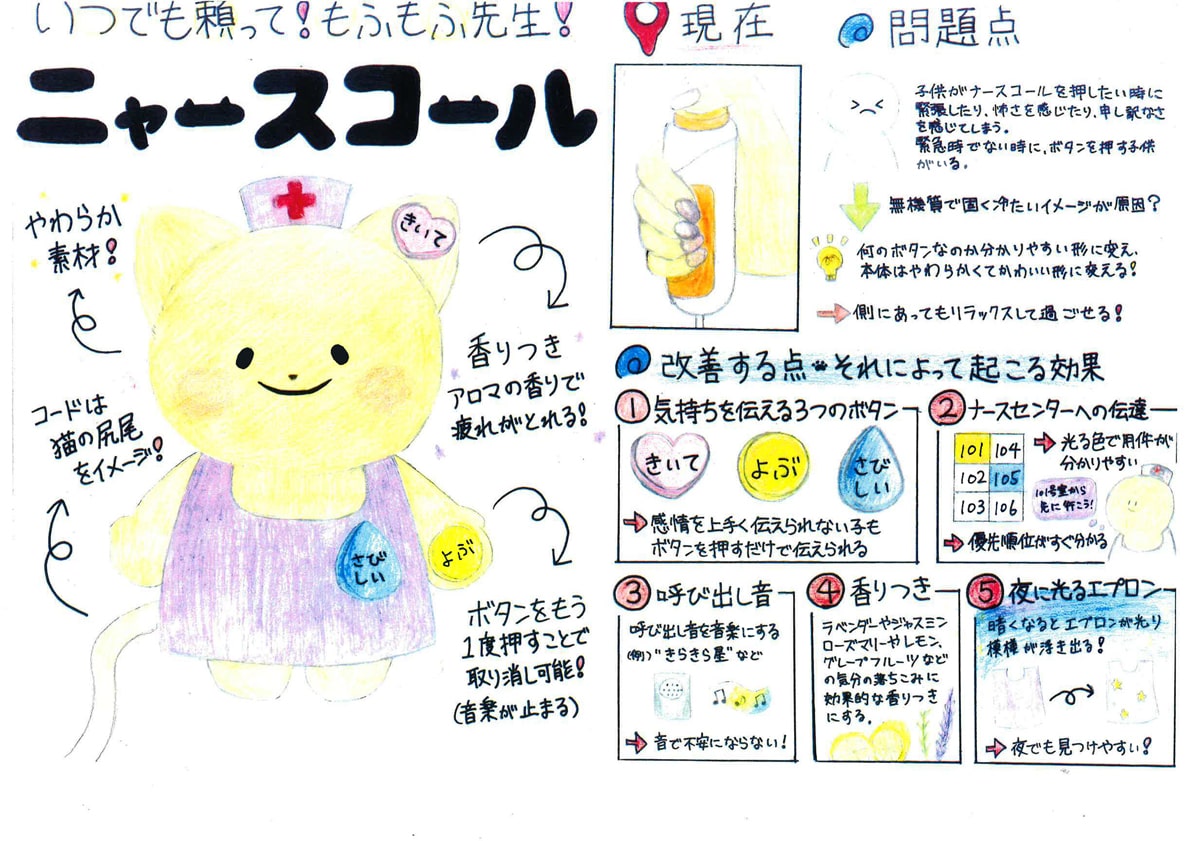 こちらのアイデアも利用する立場の視点で考えられています。確かに子どもの頃の入院は、それは不安だと思います。また、ここでは緊急時でない時に、ボタンを押す子どもがいると書いていますが、逆に気を遣う子どももいることでしょうし、大事な時に押せないこともあるでしょう。そこで「気持ちを伝える3つのボタン」が役立ちそうです。なお、対象とする年齢や男女差なども考慮したデザインが今後は必要かと思います。