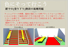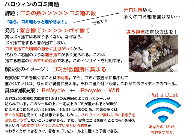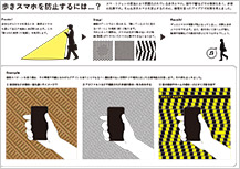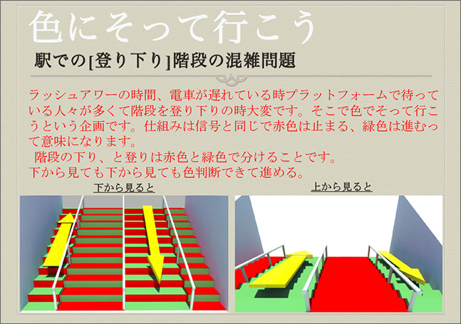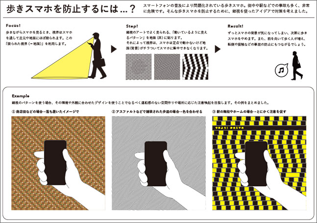 今回のアイデアの中では多かったのはスマホ絡み、電車、健康、マイボトル、ごみ問題など。審査員の中からは、「ユーモアを交えたアイデアがあってもいいよね」という声もあがり、歩道を錯視パターンにして歩きスマホを止めさせるアイデアは普通に歩いている人も気持ち悪くなりそうで実現不可能と思えますが、その発想に対して選出したものです。