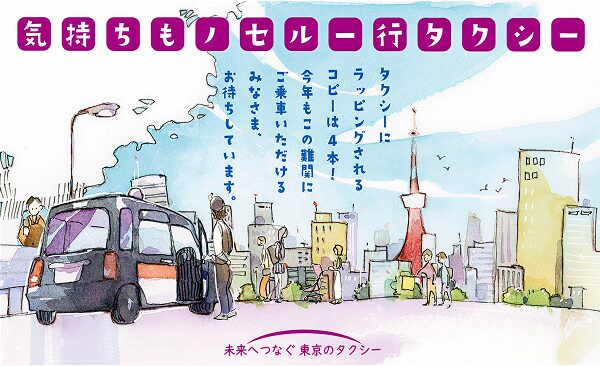 一般社団法人東京ハイヤー・タクシー協会様とのコラボレーションにて2019 年夏に始めた「1 行タクシー」。タクシーへの共感を醸成することを目的にキャッチフレーズを募集し、優秀作品を車体にラッピング。「 8月5 日タクシーの日」に向けて夏の東京を走行しています。コロナ禍の2020 年、2021 年は中止となりましたが、2022 年に復活し現在まで多くのお客様に喜んでいただいています。近年は応募総数が2万本を超えるようになりました。