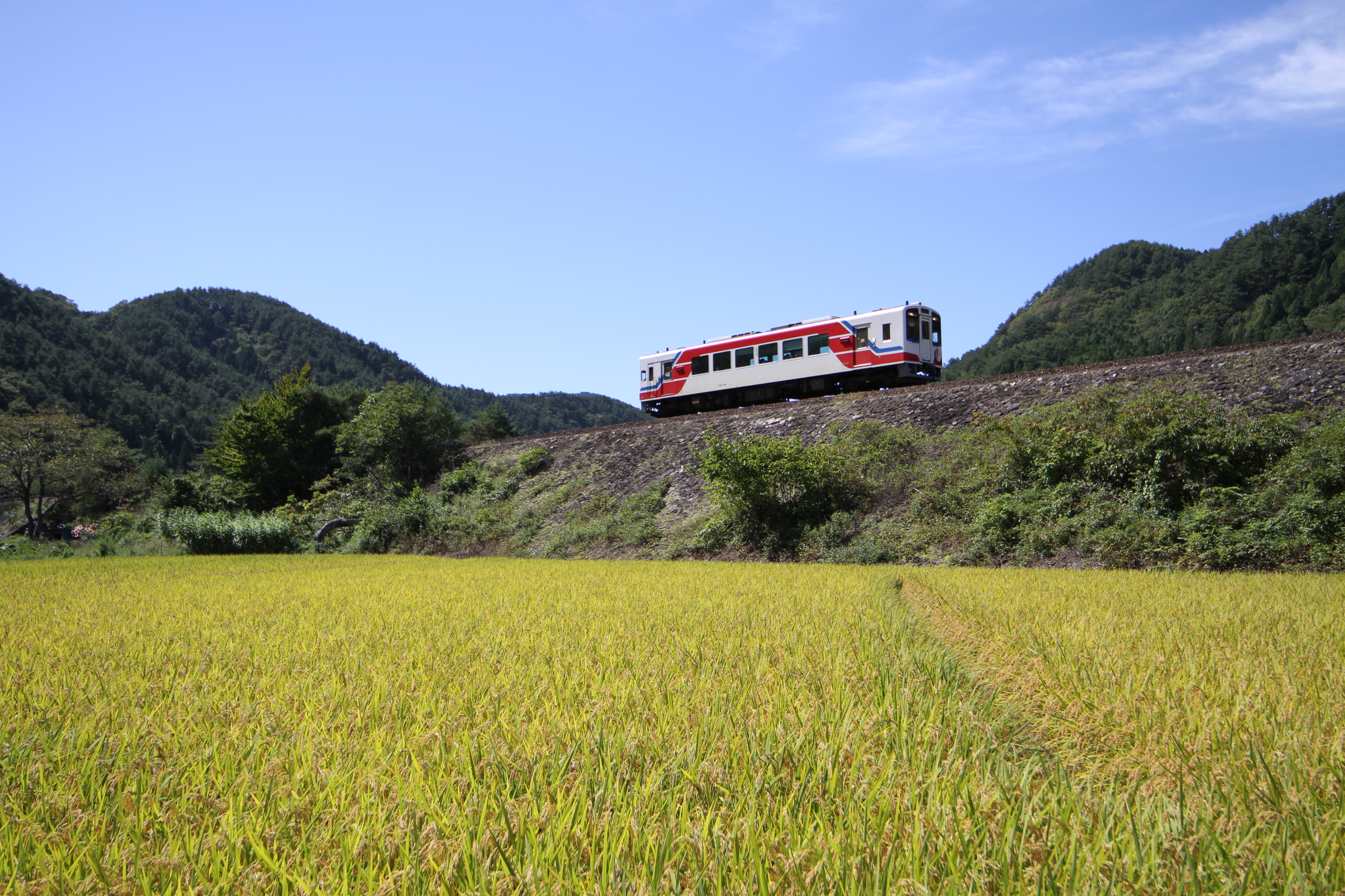 - 稲穂が実った田んぼの彼方、築堤を走る列車