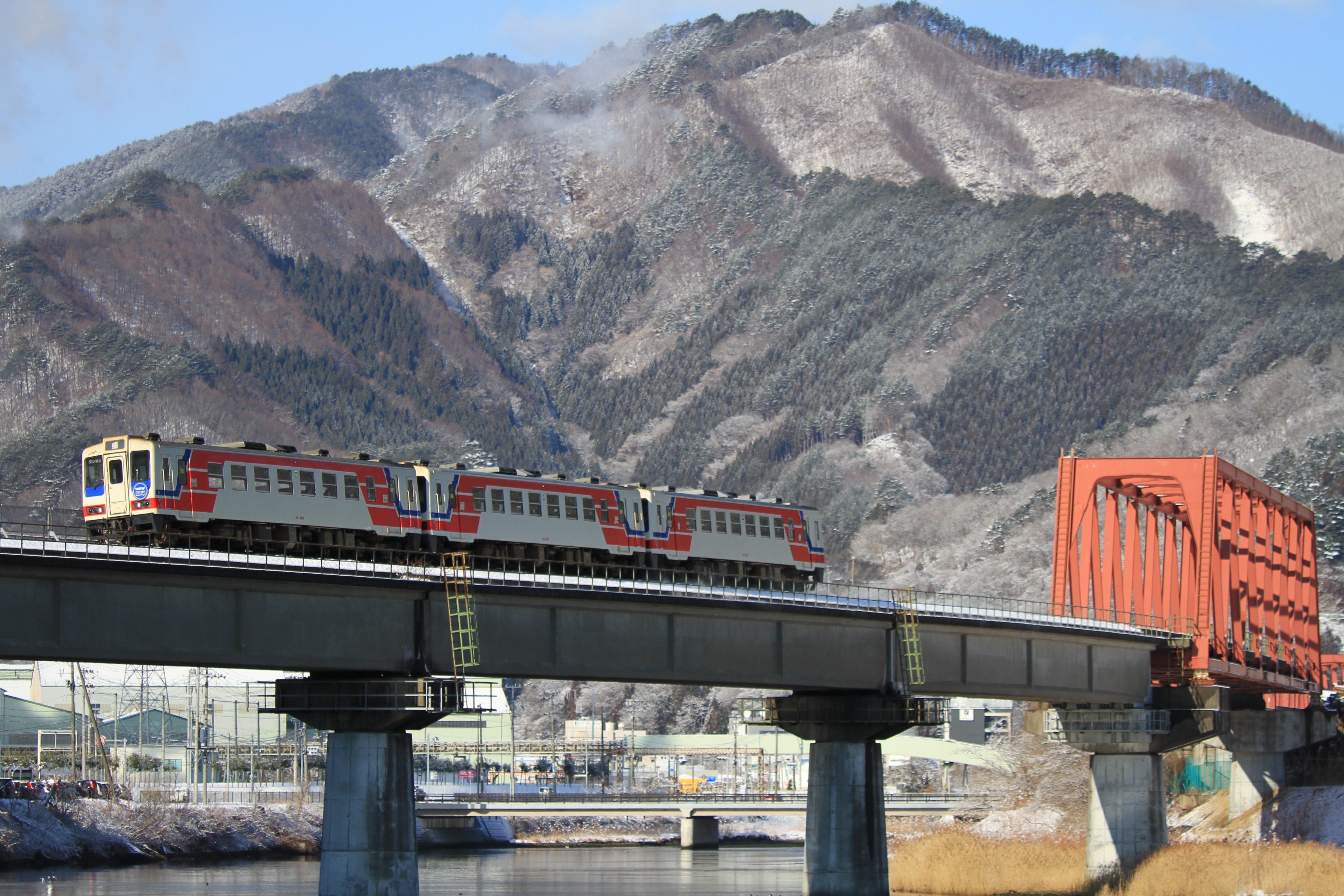 - うっすら雪を被った山をバックに鉄橋を渡る列車