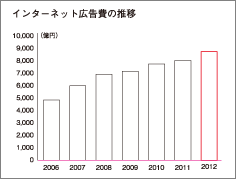 リーマンショック以降、低迷状態にある日本経済ですが、広告費は微増ながら全体的に伸長。特に、インターネット広告の急伸長は目を見張るものがあります。今後、景気が回復すれば、さらなる広告市場の成長・発展が見込まれます。