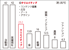 クリエイティブ産業の市場規模は、自動車産業や医療福祉業には及ばないものの、食産業や鉄鋼業などを上回っており、日本経済の中で重要なポジションにあることがわかります。