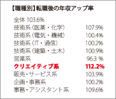 技術の進展とともに、人の技能でこなしていたことがコンピュータに代わるケースが増えていきます。そんな中、クリエイティブの仕事は「手に職を持つことができる職業」です。転職しても年収は同等か下がってしまう職種もありますが、クリエイティブ系の仕事は大幅にアップ。スキルを磨けばキャリアアップしていくことも期待できます。