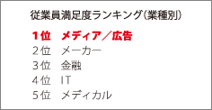 現在の職業について、25〜39歳のビジネスパーソン1000人に、給与・就業環境・仕事内容の満足度を点数(100点満点)で回答してもらったところ、総合的にもっとも満足度が高かったのが「メディア/広告」。やりがいのある仕事に就いて、毎日をいきいきと過ごしたい人には最適な業界と言えます。