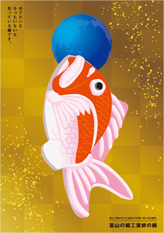 平安時代に広まった恵比寿信仰。左脇に抱えた鯛が「めでたい」に通じるといった語呂合わせから江戸時代には全国で尾頭付きの鯛が祝い膳に並ぶようになった。引出物を近所にお裾分けする文化がある富山では、鯛の漁獲が少ないため他の獲れる魚を原料にした細工蒲鉾の鯛が生まれた。蒲鉾なので日持ちがよくお裾分けの切り分けが簡単にでき捨てる部分が無いため無駄がなく引出物の定番になった。現在の日本は年間523万トンの食品ロスがあり、限りある資源の減少や環境負荷の増大・地球温暖化等に影響を及ぼしているが、無駄がない細工蒲鉾の鯛は気候風土との共生・活用・SDGs(食品ロス)の観点において誇れる伝統食と言える。
