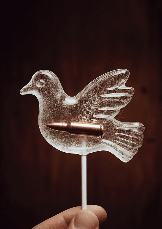 その繊細さを味わえるのも、過去に平和を守るために血と涙を流し、その犠牲となった人たちがいて、それを受け継いできたからこそ。飴細工の鳩のイメージに戦争を象徴する弾丸を入れることで、平和を考えるキッカケにし、和菓子を楽しめる日常にあって、世界各地の紛争を、そこで暮らす子どもたちのことを想ってほしい。