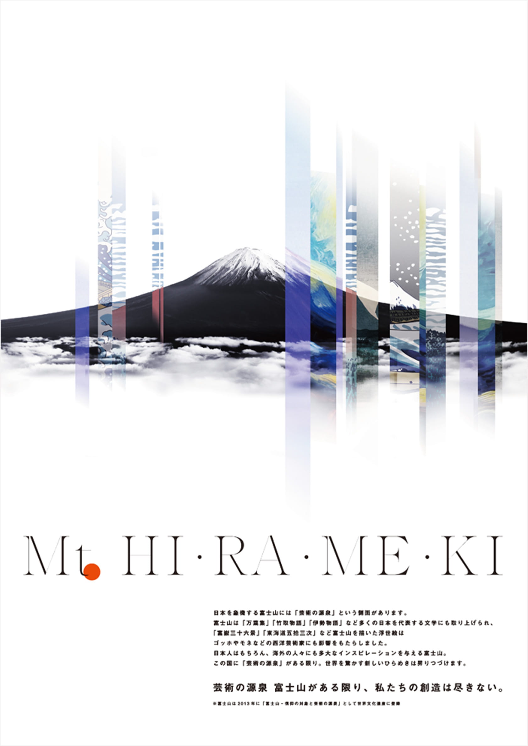 2013年に「富士山-信仰の対象と芸術の源泉-」として世界文化遺産に登録された富士山。「芸術の源泉」とあるように、富士山は日本人をはじめ海外の芸術家にも多大なインスピレーションを与え、これまでに富士山を題材とした数多くの芸術作品が生まれてきました。「芸術の源泉」富士山がある日本からは、これからも世界が驚く新しい芸術やひらめきが多数生まれてくると考え、その想いやイメージを、富士山を用いた独自のビジュアルで表現しました。