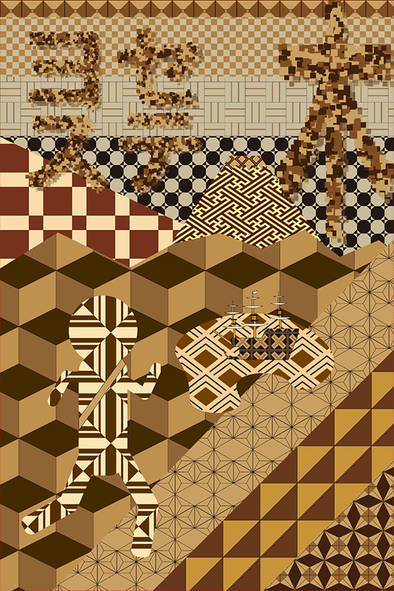 江戸時代、多種多様の樹種がある箱根山地から生み出された寄木細工。その名の通り様々な木々を寄せ集め、木材が持つ色彩と木目を組み合わせて、およそ60種類の幾何学模様を作り上げています。現代、環境都市の実現に向けて日本全国で再び木の温もりが求められている中、箱根が誇る多様性に富んだ工芸品「寄木細工」が、新たな日本像を作り出す好例となるのではないでしょうか。この作品はそんな寄木細工が作り出す新たな日本像と、箱根町の景観や箱根駅伝の選手・芦ノ湖の海賊船を組み合わせた作品です。